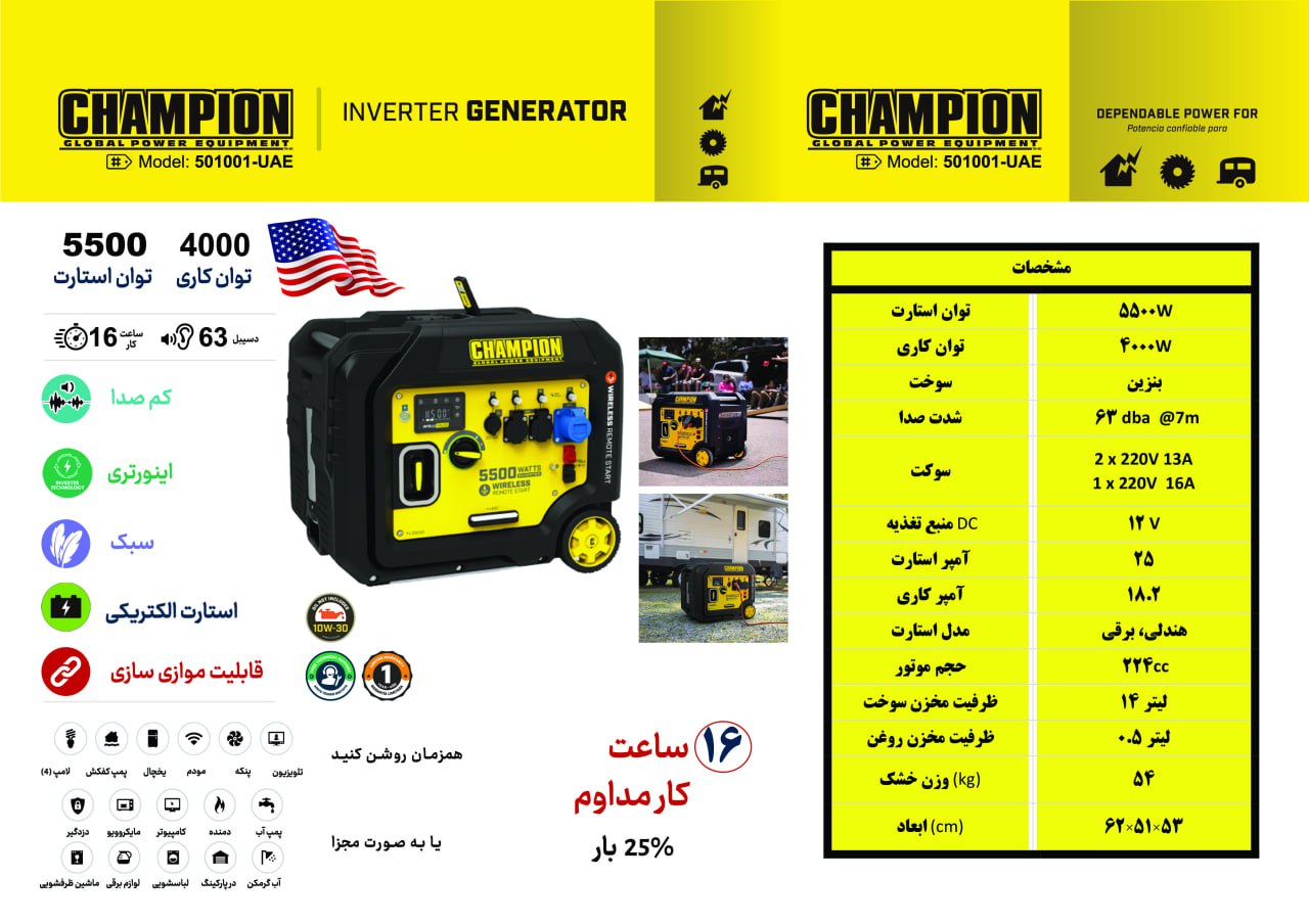 موتور برق اینورتر چمپیون 501001 یکی از پیشرفته ترین و کمصداترین موتور برق های اینورترهای بازار است که با ۵۵۰۰ وات توان استارت و ۴۰۰۰ وات توان کاری، یک انتخاب ایدهآل برای کمپینگ، کارگاه، خانه، خودروبرها و مصارف حرفهای به شمار میرود. این ژنراتور با بهرهگیری از تکنولوژی اینورتر، برق کاملاً پایدار و ایمن برای تجهیزات حساس مانند لپتاپ، تلویزیون، یخچال و شارژرها تولید میکند. این موتور برق بهترین انتخاب جهت پشتیبانی تجهیزات پزشکی ، مطب ها ، دندانپزشکی ، رادیولوژی و … می باشد .